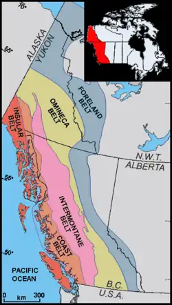 Geologic belts of far-western Canada and Southeast Alaska, including the Intermontane Belt (pink)