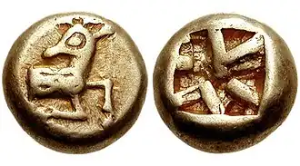 One of the earliest electrum coins struck in Ephesus, 620–600 BC. Obverse: Forepart of stag. Reverse: Square incuse punch.