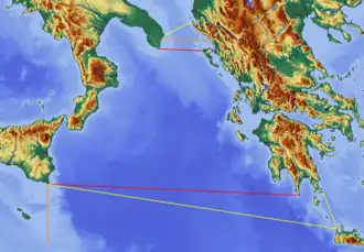 ![]() Boundaries of Ionian Sea: red lines define border per International Hydrographic Organization | |