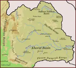 Isan is roughly coterminous with the Khorat Plateau, which tilts gently from its northwestern corner, where it is about 213 m (699 ft) above sea level, to the southeast, where the elevation is only about 62 metres (203 ft). Except for a few hills in the northeastern corner, the region is primarily gently undulating land, most of it varying in elevation from 90 to 180 m (300 to 590 ft), tilting from the Phetchabun Mountains in the west down to the Mekong River.[11]: 1  The plateau consists of two plains: the southern Khorat plain is drained by the Mun and Chi rivers, while the northern Sakon Nakhon plain is drained by the Loei and Songkhram rivers. The two plains are separated by the Phu Phan Mountains. The soil is mostly sandy, with substantial salt deposits.