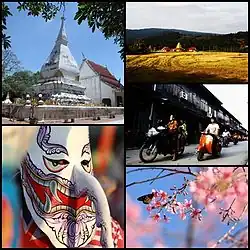 From upper-left to lower-right: First Thai–Lao Friendship Bridge, Phu Kradueng, Khao Yai, Phanom Rung Historical Park and Candle Festival
