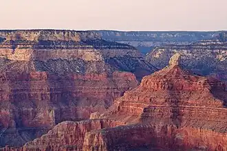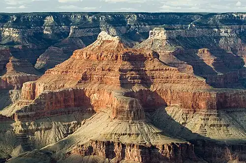 Isis Temple is a prominence in the Grand Canyon, Arizona, Southwestern United States. It is located below the North Rim and adjacent to the Granite Gorge along the Colorado River. The Trinity Creek and canyon flow due south at its west border; its north, and northeast border/flank is formed by Phantom Creek (Phantom Ranch, about 2,460 ft (750 m)) and canyon, a west tributary of Bright Angel Creek; the creeks intersect about 3 mi (4.8 km) southeast, and 1.0 mi (1.6 km) north of Granite Gorge.[4] The Isis Temple prominence (a short remainder caprock of bright-white Coconino Sandstone, on an erosion slope of brownish Hermit Formation), is only about 202 ft (62 m) lower than Grand Canyon Village, the main public center on Grand Canyon’s South Rim.