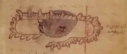 The four chorographic maps of the AD 1037 manuscript of al-Khwārizmī, including that depicting the Island of the Jewel, are the oldest surviving maps from the Islamic world.[8] Al-Khwārizmī gave the Island of the Jewel as the easternmost point of the inhabited world.[9] His gazetteer is divided by categories but altogether he provides coordinates for its coast, three cities, its surrounding chain of mountains, and two summits in the interior.[10] It lies in the Sea of Darkness near the equator,[11] east of the Golden Peninsula (Malaysia) and east of the still larger phantom peninsula now usually known as the Dragon's Tail.[12] Its center was given at 173° east of al-Khwārizmī's prime meridian off west Africa, and 2° north of the equator.[13]