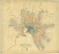 Early examples of Isochrone maps include the Galton's Isochronic Postal Charts and Isochronic Passage Charts of 1881 and 1882,[8] Bartholomew's Isochronic Distance Map and Chart first published 1889,[9] and Albrecht Penck's Isochronenkarte first published 1887.[10] Where as Galton and the Bartholomews published maps depicting the days or weeks it took to travel long distances, Albrecht further developed the idea to not only depict long distances and world travel but also smaller areas. Penck also created a series of maps that only depict the travel times of a certain transportation mode, for example rail transport. Isochrone maps are commonly used in the UK in connection with development control.[11][12][13][14] Isochrones are currently typically computed by via generating shortest-path trees on network graphs, and then generating a convex hull around the accessible nodes. Increases in computation, data storage, and improvements in algorithms have facilitated the rapid generation of isochrones.[1][15] Recent techniques in visualization include linking travel times to network edges to show the paths accessible from a point rather than show the area accessible from a point.[1]