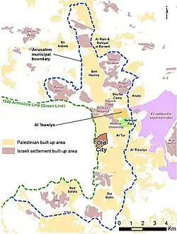 Al-Issawiya (Arabic: العيساوية, Hebrew: עיסאוויה, also spelled Isawiya or Isawiyah) is a Palestinian neighborhood in East Jerusalem.[1] It is located on the eastern slopes of the Mount Scopus ridge. To the east and north, it is bordered by Road 1, which connects Jerusalem with the settlement of Ma’ale Adumim; immediately adjoining it to the north, west and southwest are the Hadassah Medical Center, the Hebrew University campus, the Jewish settlement of French Hill and the Ofarit military base; to the south, there is a planned park, the Mount Scopus slopes national park.[2]