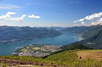 View across Lago Maggiore towards Italy, with Ascona in the foreground, Brissago and Cannobio on the right bank and Luino in the background | |