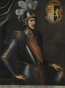In 1479, Ottoman forces reached the islands and many of the people fled from the island out of fear of the new Turkish settlers.[5] Those who remained hid in the mountains to avoid the pirates who controlled the channel between Cephalonia and Ithaca and the bays of the island. In the following five years, the Turks, Tocco and Venetians laid claim to the islands diplomatically. Possession of the islands was finally taken by the Ottoman Empire from 1484 to 1499. During this period, the Venetians had strengthened into a major power with an organized fleet. The Venetians pursued their interest in the Ionian Islands, and in 1499 a war between the Venetians and the Turks began. The allied fleets of the Venetians and the Spanish besieged Ithaca, and the other islands. The fleets prevailed, and from 1500 onwards the Venetians controlled the islands. According to a treaty of 1503, Ithaca, Cephalonia and Zakynthos would be ruled by the Venetians, and Lefkada by the Ottoman Empire. By then Ithaca was almost uninhabited, and the Venetians had to grant incentives to settlers from neighbouring islands and the mainland to repopulate it.[4] 1504, the Venetians ordered official the repopulation of Ithaca with tax incentives to attract settlers from neighbouring islands. The Venetian authorities found the island was already being repopulated by members of the Galatis family, who laid claim to it as their property, having received rights over Ithaca under the Tocco regime.[6] However, according to historians, the island received a great population revival in the period before and after the fall of Candia when numerous people from Crete arrived there as well as the noble Karavia family (Latin: Caravia), a branch of the ancient byzantine Kallergi family. This family and its followers inhabited settlements on the island, received fiefs from the Venetian Senate and indulged in a tremendously profitable maritime trade as well as piracy against the Ottomans. According to the French traveler Leake during the 18th century the families of Karavias, Petalas and the Dendrinos constituted the three main factions of the island, with the Karavias controlling its most productive part. During the next centuries the island remained under Venetian control.[7]