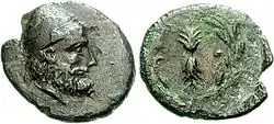 The island has been known as Ithaca from an early date, as coins and inscriptions show. Coins from Ithaca frequently portray Odysseus, and an inscription from the 3rd century BC refers to a local hero-shrine of Odysseus and games called the Odysseia.[16] The Archaeological site of "School of Homer" on modern Ithaca is the only place in the Lefkas–Kefalonia–Ithaca Triangle where Linear B inscriptions may have been found,[17] near royal remains. In 2010, Greek archaeologists discovered the remains of an 8th-century BC palace in the area of Agios Athanasios, leading to reports that this might have been the site of Odysseus's palace.[18][19]