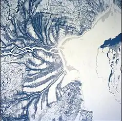 James Bay represents the southern extent of the Arctic Archipelago Marine ecozone. While the coastal areas are primarily in the Hudson Plains, the northeastern coast bordering Quebec is in the Taiga Shield ecozone. This rocky and hilly eastern shore forms the western edge of the Canadian Shield in Quebec and as such, the main habitat is boreal forest of the Eastern Canadian Shield taiga ecoregion. The western shore, however, is characterised by broad tundra lowlands that are an extension of the Hudson Bay Lowlands, and the vegetation is mostly muskeg bog. A large portion of this area is part of the Polar Bear Provincial Park. Ringed seals are common elsewhere along James Bay and polar bears can be seen hunting the seals as prey.[4] Beluga whales within James Bay basin could be distinct from those found in Hudson Bay.[5]