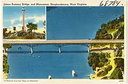 Following its completion, the monument hosted history-related events that included exercises hosted by the Daughters of the American Revolution.[62] The monument became a tourist attraction and local retailers, including B. S. Pendleton and Owens' Drug Store, sold Rumsey Monument postcards.[63][64] In 1931 and 1935, the state's department of agriculture included the monument in illustrated publications highlighting West Virginia's sites of historic and scenic interest.[65][66] In 1955, residents of Shepherdstown gifted a plaque carved with Rumsey's achievements to St Margaret's church in Westminster, England, where he was buried.[67]