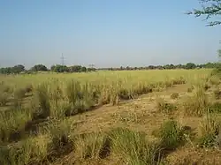 Towards the southern end of the district, good grassland becomes less common, and trees become mostly absent except in some depressions where water collects when it rains.[5] The Chenab itself widens out in the south, and the Utar becomes more narrow.[5] Traces of river action are more common here, with more depressions and sand dunes.[5] At the far southern end of the district is a distinct area formed by relatively recent river activity; the soil here is light and sandy, and the water table is very high and close to the surface.[5] Areas here that are not under cultivated are covered by a dense growth of sar grass.[5]