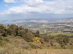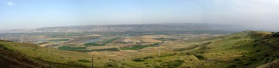 The Jordan Valley (Arabic: غَوْر الأُرْدُنّ, romanized: Ghawr al-Urdunn; Hebrew: עֵמֶק הַיַרְדֵּן, romanized: Emek HaYarden) forms part of the larger Jordan Rift Valley. Unlike most other river valleys, the term "Jordan Valley" often applies just to the lower course of the Jordan River, from the spot where it exits the Sea of Galilee in the north, to the end of its course where it flows into the Dead Sea in the south.[1] In a wider sense, the term may also cover the Dead Sea basin and the Arabah valley, which is the rift valley segment beyond the Dead Sea and ending at Aqaba/Eilat, 155 km (96 mi) farther south.[2]