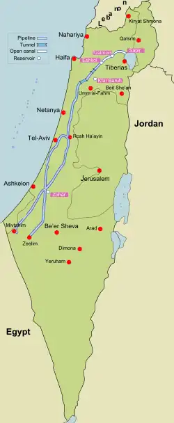 The Jordan Valley Unified Water Plan, commonly known as the "Johnston Plan", was a plan for the unified water resource development of the Jordan Valley. It was negotiated and developed by US ambassador Eric Johnston between 1953 and 1955, and based on an earlier plan commissioned by United Nations Relief and Works Agency for Palestine Refugees in the Near East (UNRWA). Modeled upon the Tennessee Valley Authority's engineered development plan, it was approved by technical water committees of all the regional riparian countries—Israel, Jordan, Lebanon and Syria.[31] Though the plan was rejected by the Arab League, both Israel and Jordan undertook to abide by their allocations under the plan. The US provided funding for Israel's National Water Carrier after receiving assurances from Israel that it would continue to abide by the plan's allocations.[32] Similar funding was provided for Jordan's East Ghor Main Canal project after similar assurances were obtained from Jordan.[33]