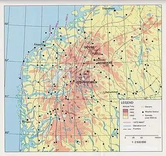 Jotunheimen lays in the transition zone from a maritime climate in the west and a more continental climate towards the east. The high mean annual precipitation in the west leads to a low glaciation limit of less than 1500 meters, the altitude where glaciers can be formed. In the east of Jotunheimen, glaciers are rare and the glaciation limit rises to an altitude of more than 2100 meters. The opposite trend may be registered for the mean annual air temperatures (MAAT). It drops about 600 meters for any given value of a MAAT, The MAAT of -3.5 °C indicates areas with occurrences of widespread mountain permafrost. Thus, permafrost existis in large parts of Jotunheimen due its more continental climate.[7]