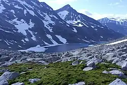 Since the 1980s, the Jotunheimen area has got increased scientific interest from geologists and geomorphologists due to its climate creating periglacial landforms and widespread and often thick permafrost occurrences. A first comprehensive study on mountain permafrost in Scandinavia was published in 1982.[8] Today, these findings are confirmed at various places, and Juvvasshøi, Juvasshytta and Galdhøi are preferred areas for scientific periglacial research due to yearround good logistic conditions compared with arctic areas.[9]