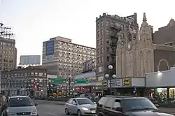 The bridge carrying the boulevard was designed by consulting engineer Abraham Burton Cohen and completed in 1926.[6] For most of the twentieth century Journal Square was the cultural entertainment center of Hudson County,[7] home to the movie palaces built in the 1920s: The State (1922, and since demolished),[8] the Stanley Theater (1928),[9] and the Loew's Jersey Theater (1929).[10] Karen Angel of The New York Daily News described Journal Square from the 1920s to the 1960s as a "crown jewel, a glowing commercial, entertainment and transportation hub of the city."[11] The "Jersey Bounce", a hit song in the 1940s mentions Journal Square in its lyrics as the place where it got started. Two days before Election Day in 1960 John F. Kennedy made his last campaign speech at Journal Square, before returning to New England.[12] Hudson Boulevard was named Kennedy Boulevard soon after his assassination. The Tube Bar, so-called for the Hudson Tubes (as the fore-runner of the PATH system was called) was made famous by Louis "Red" Deutsch getting prank calls there.[13]