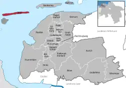 Juist (German pronunciation: [ˈjyːst] ⓘ; Low German: Juist) is an island and municipality in the district of Aurich in Lower Saxony in Germany. The island is one of seven East Frisian Islands at the edge of the Lower Saxon Wadden Sea in the southern North Sea. It is located between Borkum Island (west), Memmert Island (southwest) and Norderney (east). The island is 17 km (11 mi) long and from 500 metres (1,600 ft) to 1 kilometre (0.62 mi) wide, depending on the tide levels. There are two villages on the island: the main village Juist, and Loog. The island is separated from Norderney by the Norderneyer Seegatt.
