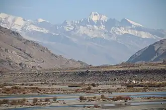 Karl Marx Peak (Russian: Пик Карла Маркса; Tajik: Қуллаи Карл Маркс) rises to 6,723 m (22,057 ft) in the Shakhdara Range in Pamir Mountains, in the south-west of Tajikistan's Gorno-Badakhshan Autonomous Province (eastern part of Ishkoshim district), just north of the Panj River and the Afghanistan border.[2][3][4] It was named after the German philosopher Karl Marx whose theories were the basis of communism and socialism. The highest summit in the Shakhdara Range, it was discovered and named in 1937 by Soviet geologist and explorer of South-West Pamir Sergey Klunnikov.[5] The ascent was delayed by the outbreak of World War II, and Karl Marx Peak was first climbed in 1946 by a group of Soviet alpinists led by Evgeniy Beletskiy.[6]