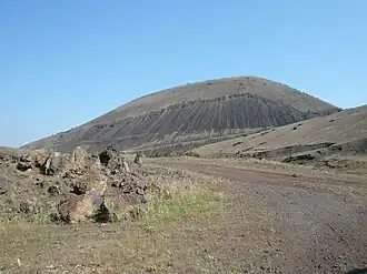 The name means "burnt land"[2][3] or "burnt country",[4] referring to the pitch-black color of the lava[5] and the dormant volcanic belt of Kula,[6] which was first described by Strabo.[7] Strabo reported that a place named Katakekaumene was the site of the mythological battle between Zeus and the giant Typhon.[8]