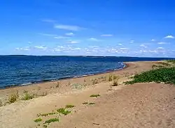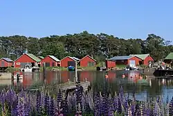 Kaunissaari forms part of an esker that juts out into the Gulf of Finland. The soil also has a glacial till on the west side of the ridge formation. The trees are mainly pines; the southern part of the island has culturally influenced, lush vegetation, and much deciduous trees.[2] Sand beaches are located on the north and east side of the island.[1] At the southern end of Kaunissaari is a fishing village, the oldest buildings of which are from the 19th century, although the earliest records of Kaunissaari's settlement date from the 1560s.[3] Of these, the old fishing village and the island's sandy beaches make the island a popular excursion destination, which is why Kaunissaari is the most popular seaside tourist destination in Kymenlaakso and the most versatile archipelago destination in terms of service equipment.[4] Tourists and villagers in Kaunissaari are served by a retail store, restaurant and café opened in the 1980s and an archipelago museum, which presents the local history of the island.[1][5] Kaunissaari holiday village offers accommodation in log cabins, and the old school building can also be rented for small groups.[5] The current guest marina was built in the early 1990s because the old one became congested due to tourism.[3]