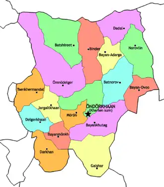 {{cite web}}: CS1 maint: archived copy as title (link) - ^ a b The Khentii aimag official site Archived 2007-10-07 at the Wayback Machine