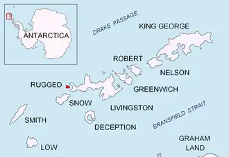 ![]() Location of Rugged Island in the South Shetland Islands | |