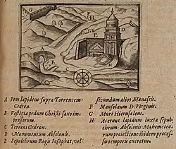 In the times of the Old Testament kings, the Kidron Valley was identified with, at least in part, the King's Garden; the kings owned land in the area.[9] That the upper Kidron Valley was also known as the King's Valley, in which Absalom set up his monument or "pillar" (see 2 Samuel 18:18; no connection to the much later "Absalom's Pillar"), is problematic. The Bible does not make this identification explicit, and the association can only be inferred as associated with En-rogel, which is farther down the Kidron Valley towards the desert.[14]
