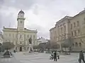 - Statue of György Klapka and the Town Hall – Today's square was created at a place of a small lake, which was formerly protecting by the walls of the medieval city. A marketplace was created there later. On the north side of it, at the end of the 17th century, there was a town hall for council meetings. In 1725 it was rebuilt. After major damage caused by the earthquake in 1763, it was restored in 1766 and supplemented in the following year by a fire guard tower. After a fire in 1848, the building was renovated again, but it was necessary to enlarge it, so in 1875 it was updated by a new watchtower, creating a town hall in the way we know it today.