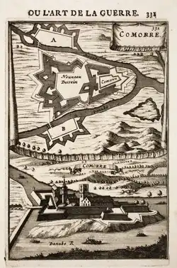 One disputed record of the name of the settlement can be dated back to 1075 as Camarum. Further documents mention the settlement as Kamarn(iensis) / Komarn(iense) (1218), Kamarum (1266), Camarum (1268), Kamar (1283) and many other, e.g. Camaron, Comaron (between 1372 and 1498). Villa Camarun was one of the 23 settlements belonging to the domain of the Komárom castle.