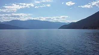 Kootenay Lake is a long, narrow and deep fjord-like lake located between the Selkirk and Purcell mountain ranges in the Kootenay region of British Columbia.[3][4] It is one of the largest lakes in British Columbia, at 104 km in length and 3–5 km in width.[1] It is, in part, a widening of the Kootenay River, which in turn drains into the Columbia River system at Castlegar, British Columbia.[1]