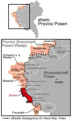 The Bomst district had a mixed population of Germans and Poles. The population of the district was almost evenly split between Germans and Poles. After the border change in 1919, in the part of the district that remained in Germany, there was a substantial Polish minority of 20.6% according to the 1925 census.