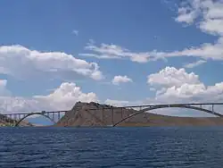 The bridge is at the north end of Krk island and uses the small island of Otočić Sveti Marko (St. Mark's Islet) as a mid-support. The bridge was completed and opened in July 1980 and originally named Tito's Bridge (Croatian: Titov most) in honor of Yugoslav president Josip Broz Tito, who had died two months earlier.[13] The bridge has since been renamed Krk Bridge or Krčki most.