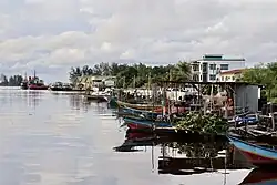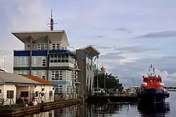 Water transportation in Kuala Belait is facilitated by a public wharf near the market, where visitors can hire water taxis to travel upriver towards Kuala Balai. Additionally, the Kuala Belait Boat Club organizses trips for sailing out to the open sea and visiting various nearby destinations.[52] Historically, a timber jetty existed in Rasau as early as 1930. The Kuala Belait Port, one of Brunei's three ports,[53] has sections near the river mouth operated by Brunei Shell, restricting public access. The commercial port is situated further upriver in Kampong Sungai Duhon and surrounding areas.[54] However, due to silting at the river mouth, the port can only accommodate shallow draft vessels.[55] To combat this issue, two breakwaters have been constructed at the mouth of the Belait River to help reduce silting.[56]