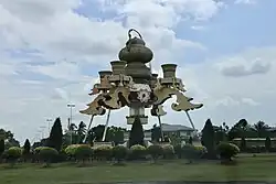 - The Tugu Replika Sumbangsih Ciri or Tea Pot Roundabout[63] in Kampong Pandan was built around 2001 and is located at the roundabout on Jalan Singa Menteri and Jalan Pandan Lima. Constructed entirely of concrete, it serves as one of the landmarks in Kuala Belait, a gift from Brunei Shell Petroleum (BSP) to Sultan Hassanal Bolkiah in honour of the Visit Brunei Year 2001. Standing at a height of 58 feet (18 m), the monument features a teapot at the top, with four large cups on either side, each symbolising the hospitality, warmth, and respect the people of Brunei show to visitors.[64]