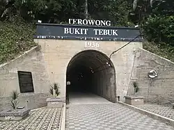 During the 1940s iron-mining boom, extraction took place at Bukit Besi, a modest town inland to the west, and Kuala Dungun served as the seaport for shipping out the ore. A railway between them not only moved iron to the docks but also doubled as the local passenger line for villagers, the Dungun township, and nearby businesses. When the mines were gradually closed-down in the 1970s and 1980s, the rail service stopped and the mining company left the area.[2] Therefore, the only remnant from the iron mining era is the tunnel that is called Bukit Tebuk Tunnel. The tunnel was originally carved to shorten the trains transportation distances from the mines in Bukit Besi to Pengkalan Nibong. Once the mining activities closed, it was repaved for automobile use.[3]