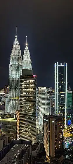 High-rise office blocks and hotels around Petronas Twin Towers, from left (directly in front of the Twin Towers) is Menara Carigali, Menara Maxis, Mandarin Oriental Hotel and Four Seasons Place Kuala Lumpur.
