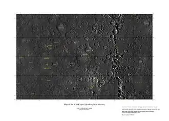 - De Hon, R.A.; Scott, D. H.; Underwood, J. R. Jr. (1981). "Geologic Map Of The Kuiper (H-6) Quadrangle Of Mercury" (PDF). Prepared for the National Aeronautics and Space Administration by the U.S. Department of the Interior, U.S. Geological Survey. Published in hardcopy as USGS Miscellaneous Investigations Series Map I–1233, as part of the Atlas of Mercury, 1:5,000,000 Geologic Series. (Hardcopy is available for sale from U.S. Geological Survey, Information Services, Box 25286, Federal Center, Denver, CO 80225)
