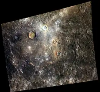 The cratered plains material is relatively flat with broad ridges and lobate scarps that in places resemble those of some of the lunar maria. It is difficult to obtain reliable crater counts on this unit because many secondary craters cannot be distinguished from primary craters. Cratered plains materials embay craters in classes c1 to c3; they may represent lava flows extruded after an initial phase ofimpact flux. The albedo of the cratered plains is intermediate compared to that of other mercurian units, but higher than that of the lunar maria, and may reflect lower iron and titanium content.[1]