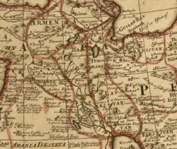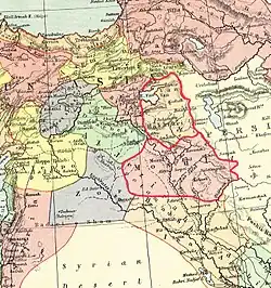 "Kurdistan" was also formerly spelled Curdistan.[20][21] One of the ancient names of this region was Corduene.[22][23] The 19th-century Kurdistan Eyalet was the first time that the Ottoman Empire used the term 'Kurdistan' to refer to an administrative unit rather than a geographical region.[24]