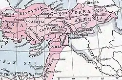 The Kingdom of Corduene, which emerged from the declining Seleucid Empire, was located to the south and south-east of Lake Van between Persia and Mesopotamia and ruled northern Mesopotamia and southeastern Anatolia from 189 BC to AD 384 as vassals of the vying Parthian and Roman empires. Corduene became a vassal state of the Roman Republic in 66 BC and remained allied with the Romans until AD 384. After 66 BC, it passed another 5 times between Rome and Persia. Corduene was situated to the east of Tigranocerta, that is, to the east and south of present-day Diyarbakır in south-eastern Turkey.