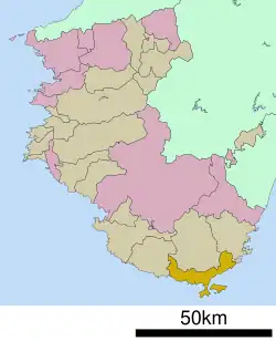 Kushimoto (串本町, Kushimoto-chō; Japanese pronunciation: [kɯ̥.ɕiꜜ.mo.to, -ɕi.mo.toꜜ.tɕoː][1]) is a coastal town located in Higashimuro District, Wakayama Prefecture, Japan. As of 30 November 2021, the town had an estimated population of 15,192 in 8354 households and a population density of 110 persons per km2.[2] The total area of the town is 135.67 square kilometres (52.38 sq mi).
