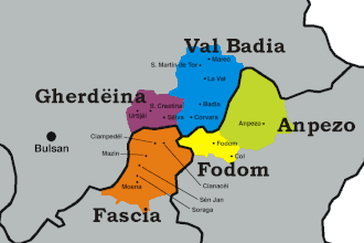 (km2)Population Anpezo Cortina d’Ampezzo Hayden Belluno 255 6,150 Urtijëi Ortisei St. Ulrich in Gröden South Tyrol 24 4,569 Badia Badia Abtei South Tyrol 82 3,237 Mareo Marebbe Enneberg South Tyrol 161 2,684 Moéna Moena Moena Trentino 82 2,628 Sëlva Selva di Val Gardena Wolkenstein in Gröden South Tyrol 53 2,589 Poza Pozza di Fassa Potzach im Fassatal Trentino 73 1,983 Cianacei Canazei Kanzenei Trentino 67 1,844 Santa Cristina Gherdëina Santa Cristina Valgardena St. Christina in Gröden South Tyrol 31 1,840 San Martin de Tor San Martino in Badia St. Martin in Thurn South Tyrol 76 1,727 Fodom Livinallongo del Col di Lana Buchenstein Belluno 99 1,436 Corvara Corvara Kurfar South Tyrol 42 1,266 La Val La Valle Wengen South Tyrol 39 1,251 Vich Vigo di Fassa Vig im Fassatal Trentino 26 1,142 Ciampedèl Campitello di Fassa Kampidel im Fassatal Trentino 25 732 Sorèga Soraga Überwasser Trentino 19 677 Mazin Mazzin Mazzin Trentino 23 440 Col Colle Santa Lucia Verseil Belluno 15 418