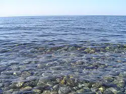 Baikal is one of the clearest lakes in the world.[14] During the winter, the water transparency in open sections can be as much as 30–40 m (100–130 ft), but during the summer it is typically 5–8 m (15–25 ft).[29] Baikal is rich in oxygen, even in deep sections,[29] which separates it from distinctly stratified bodies of water such as Lake Tanganyika and the Black Sea.[30][31]