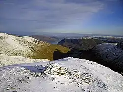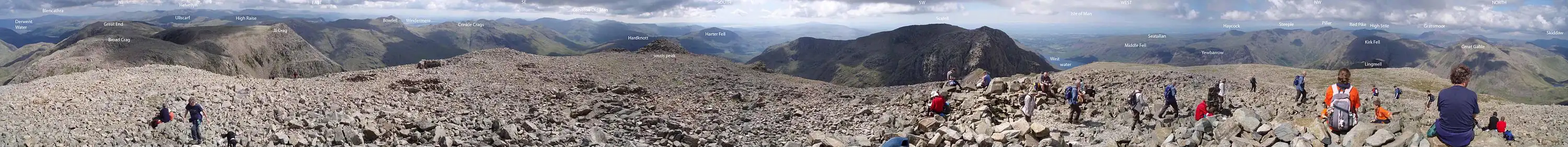 The highest mountain in England, Scafell Pike (978 m or 3209 feet), has a far-reaching view on a clear day, ranging from the Galloway Hills of Scotland, the Mourne Mountains in Northern Ireland, the Isle of Man, and Snowdonia in Wales.