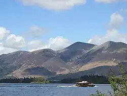 The Lakeland fells, or mountains, include England's highest:[4] Scafell Pike (978 m; 3,209 ft), Helvellyn (950 m; 3,120 ft) and Skiddaw (931 m; 3,054 ft). The region also contains sixteen major lakes.[5] They include Windermere, which with a length of 11 miles (18 km) and an area of 5.69 square miles (14.73 km2) is the longest and largest lake in England, and Wast Water, which at 79 metres (259 ft) is the deepest lake in England.[6][7]