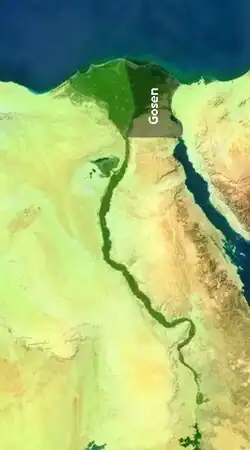 The land of Goshen is mentioned in the biblical books of Genesis and Exodus. In the story of Joseph, which comprises the final chapters of Genesis, the patriarch Jacob is facing famine and sends ten of his sons to Egypt to buy grain.[1] Joseph, another of Jacob's sons, is a high official in Egypt and allows his father and brothers to settle in Egypt.[2] In Genesis 45:10, Goshen is treated as being close to Joseph, who lives at the pharaoh's court[3] and in Genesis 47:5 Goshen is called "the best part" of the land of Egypt.[4] But it is also implied to be somewhat set apart from the rest of Egypt,[5] because Joseph tells his family to present themselves to the pharaoh as keepers of livestock, "in order that you may settle in the land of Goshen, because all shepherds are abhorrent to the Egyptians."[6] Genesis 47:11 interchanges the "land of Rameses" with Goshen: "Joseph settled his father and his brothers and granted them a holding in the land of Egypt, in the best part of the land, in the land of Rameses, as Pharaoh had instructed."[7]