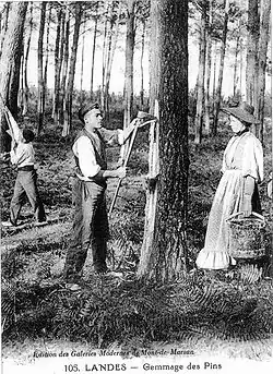 Tapping trees is a thousand-year-old activity in the Landes de Gascogne. The first tappers exploited the embryos of what would become the largest forest in Europe to make a sort of tar used for caulking boats. They were found near the coast, in Lacanau, La Teste-de-Buch, Arcachon, Biscarrosse and Hossegor. With the disappearance of pastoralism and the massive plantations of maritime pines, the tapping process spread throughout the forest and became a flagship industrial activity of the region until the 1950s. After distillation of the harvested resin, two compounds are obtained that are useful for industry: rosin (70%) and turpentine (20%). The outlets were mainly in the chemical industry. Tapping disappeared at the end of the 1980s, and nowadays the Landes Forest feeds the paper industry. Tourism has also been one of the region's main sources of income since the beginning of the 20th century.