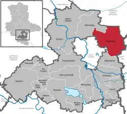 The municipal area immediately borders the independent city of Halle in the southwest and the Nordsachsen district of Saxony in the southeast. After several incorporations in recent years, it currently comprises 11 localities (Ortschaften):[3]