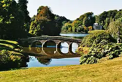 The English landscape garden, also called English landscape park or simply the 'English garden', is a style of parkland garden intended to look as though it might be a natural landscape, although it may be very extensively re-arranged. It emerged in England in the early 18th century, and spread across Europe, replacing the more formal, symmetrical jardin à la française of the 17th century as the principal style for large parks and gardens in Europe.[47] The English garden (and later French landscape garden) presented an idealized view of nature. It drew inspiration from paintings of landscapes by Claude Lorraine and Nicolas Poussin, and from the classic Chinese gardens of the East,[48] which had recently been described by European travellers and were realized in the Anglo-Chinese garden,[48] and the philosophy of Jean-Jacques Rousseau (1712 – 1778).