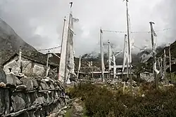 Among themselves, the local inhabitants of the Langtang valley refer to each other as 'Langtangpa'. They generally follow Tibetan Buddhism, and speak a Tibetan language that is closely related to the Tibetan spoken in Kyirong, southern Tibet. The Langtangpas regard the mountain Langtang Lirung as their 'yu-lha', their local country god. However, in the state census, the Langtangpas are categorised as Tamang.[4] Langtang valley is believed to be the Beyul Dagam Namgo, one of the many hidden valleys blessed by Guru Padmasambhava.[5]